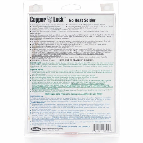 ComStar’s Copper Lock is the revolutionary and environmentally safe method for soldering pipes designed for the US Space Program! This unique product instantly bonds copper and brass pipes/fitting without the use of heat or metal solder. Copper Lock is great for all yellow metals, copper and brass pipe and fittings, and all refrigerants and liquids.