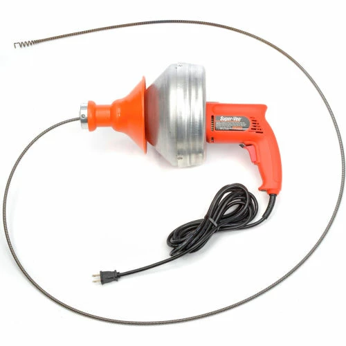 The Super-VeeTM offers you a complete system for cleaning drain lines through 3″ in diameter. With a variety of cables, cutters, and accessories available, you have the right combination for any clogged drain problem.The Super-Vee is built to clear clogged drains for a decade or more. And our Dyna-ThrustTM bearing system is one reason why. It helps carry the weight of the drum, significantly reducing wear on the motor shaft bearing and extending the life of the tool. Of course the cables are Flexicore® – with an integral wire rope center. Nobody makes cables like General. With a quick movement of the Grip Shield, you release or engage the cable – without the need for a chuck, and with automatic adjustment for different diameter cables. As a result, you get your cable into the line faster, pull it out faster, and have full control at all times. Because the chuck is linked to the Grip Shield, handling is easy and comfortable. To switch to a different diameter cable (or even connect two 3/8″ cables together), you just loosen three screws, pull the front of the drum off the cable, and load in another cartridge. Changing takes less than a minute and turns what could be a messy job into a clean one. The tough plastic cartridges are so inexpensive, you’ll probably want to store all of your cables in them.