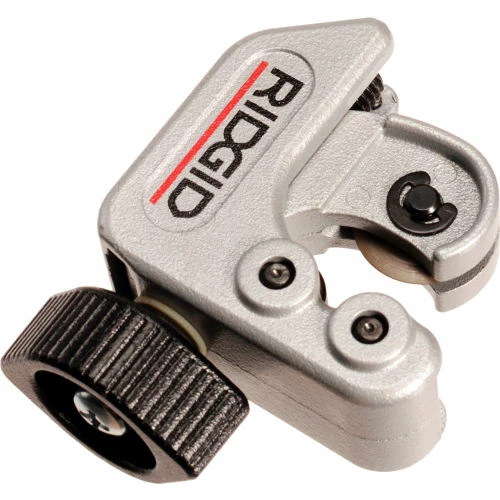 Specifically designed for use in restricted spaces on small diameter, hard and soft copper, aluminum, brass and plastic tubing; rollers include grooves for close-to-flare cuts. Strong, lightweight slide and wheel housing, large knurled feed screw knob gives easy control of cutting pressure for clean cuts. Models 117 and 118 include a self-feeding cutter wheel that automatically cuts after tightening the knob only once. The Model 117 a special knob for easier tightening of the feedscrew.