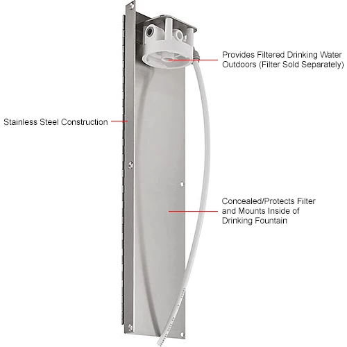 Provide visitors and guests with refreshing and filtered outdoor drinking water with the Global Industrial® Water Filter Door and Bracket for Rotocast Outdoor Drinking Fountains. Its integrated design replaces the existing access panel, which means doing away with a bulky exterior filter box, making it the sleek choice for recreational areas, commercial office grounds, and parks. Equipped with mounting screws, a mounting bracket, and quick connect fittings, the installation process is fast and easy. Compatible with water filer, model #670336 (sold separately). 1 Year Limited Warranty.